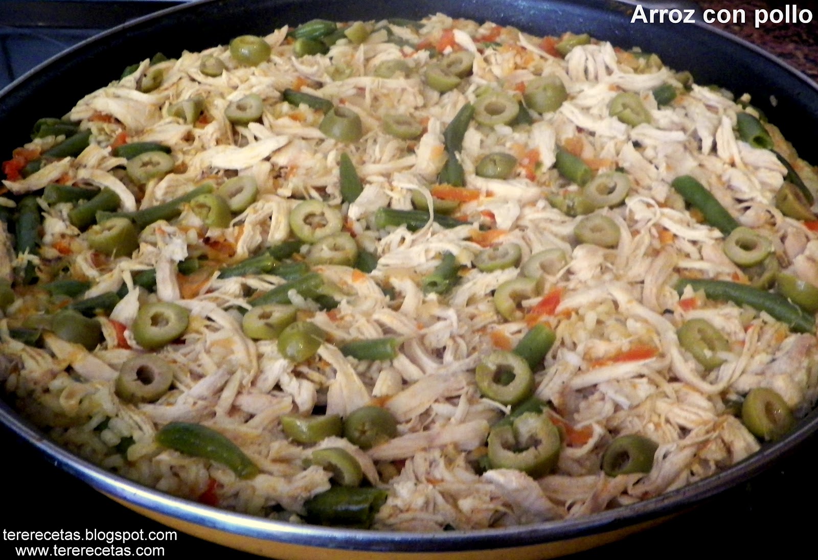 Corta la cebolla, el pimiento y el tomate en cuadritos y en una paellera sofríe con el aceite por unos 20 minutos. Echa el pollo, el arroz y las judías y sofríe todo por otros 5 minutos mas, agrégale 4 tazas y media del caldo donde herviste el pollo (si no te alcanza a esta cantidad, añádele agua). Corta en ruedas las aceitunas y echálas adornando por toda la superficie luego de vertir el caldo.