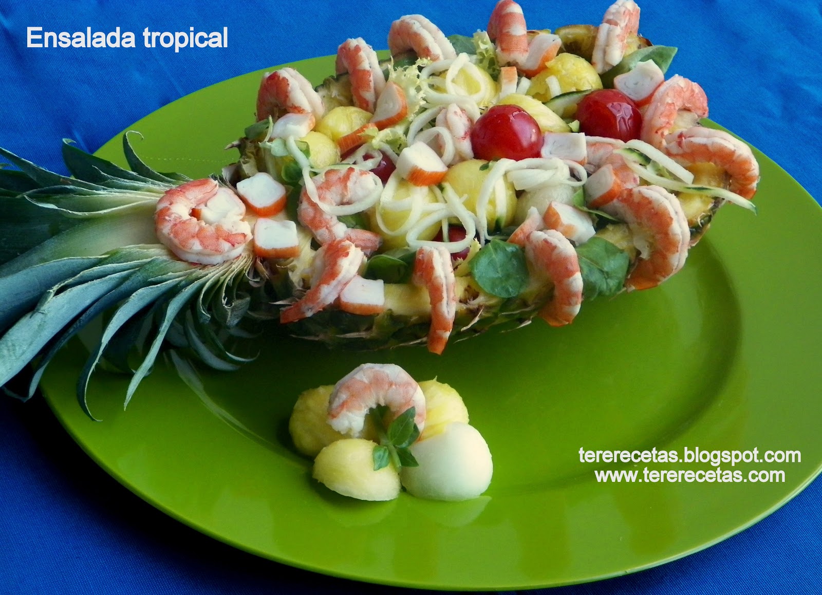 Con un sacabocado haz bolas con la carne de la piña hasta vaciarla, con el mismo utensilio haz bolas con el melón, con un pela patatas haz tiras con el pepino y córtalas en tiras pequeñas, pela los langostinos y haz una cama con las lechugas dentro de la piña vaciada, rellena adornando a tu gusto con las bolas de las frutas, los langostinos, el pepino, los tomates cherry, el surimi cortado en trocitos.