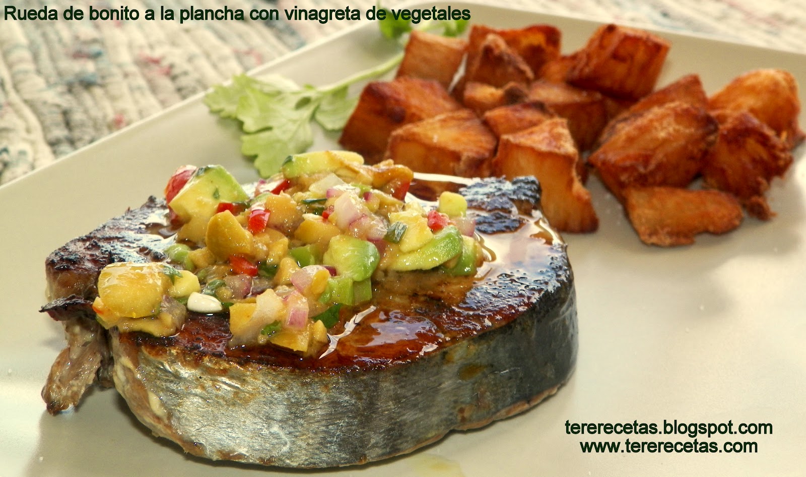Rodaja (rueda) de bonito a la plancha con vinagreta de vegetales