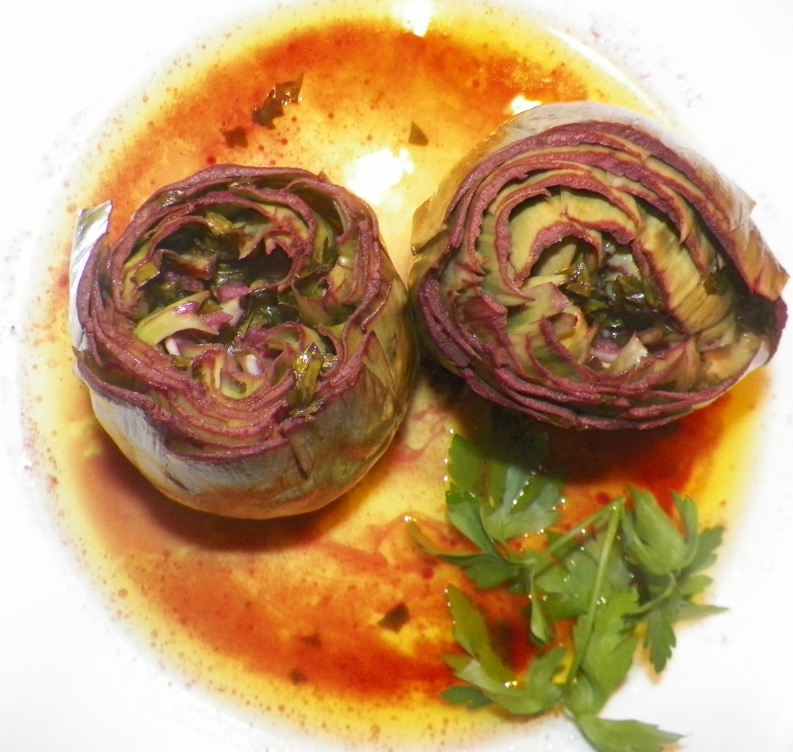 Pon las alcachofas en una olla junto con la 1/2 taza de aceite de oliva, déjalas tapadas por unos 10 minutos a fuego medio, luego añade la media taza de vino y sube a fuego alto por al menos 25 minutos mas, volteando las alcachofas casa 5 minutos. Puedes decorar con virutas de queso parmesano o taquitos de jamón serrano. Sencillamente delicioso