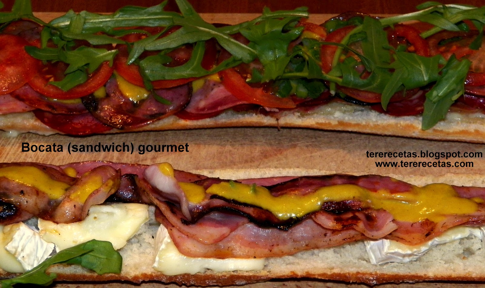 Corta el tomate en rodajas finas y el cebollino en trocitos muy pequeños, saca del horno las dos mitades del pan y arma junto con los demás ingredientes, échale la rúcula, los tomates y el cebollino y luego le pones la mezcla de la mostaza. El mejor de los bocatas que hayas probado!!!! Acompáñalo con una copa de vino tinto o una cerveza muy fría.
