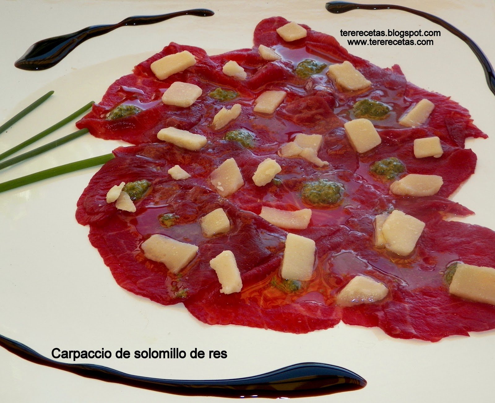 Una vez cortada la carne, sirve en porciones individuales, loncha a loncha, en la forma que prefieras, haces una mezcla con el aceite de oliva y unas gotitas del limón, con una cucharilla pequeña ve echando un poco de esta mezcla, al igual que con la salsa pesto a toda la carne, igualmente esparces las escamas del queso parmesano, adorna y sirve….. Un entrante maravilloso!!!