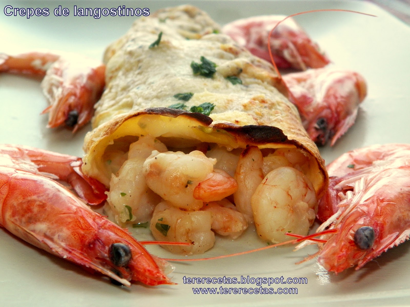 Hola a todos… Aquí te traigo unas deliciosas Crepes de langostinos. Se llama crepe, crep o crepa (del francés crêpe, y éste a su vez del latín crispus, ‘crespo’) a la receta de origen francés hecha fundamentalmente de harina de trigo, leche y huevo, con el que se elabora una masa en forma de disco. Se sirve habitualmente como base de un plato o postre aplicándole todo tipo de ingredientes dulces o salados. Aquí te la presento con un relleno de langostinos, un plato delicioso para una ocasión especial…