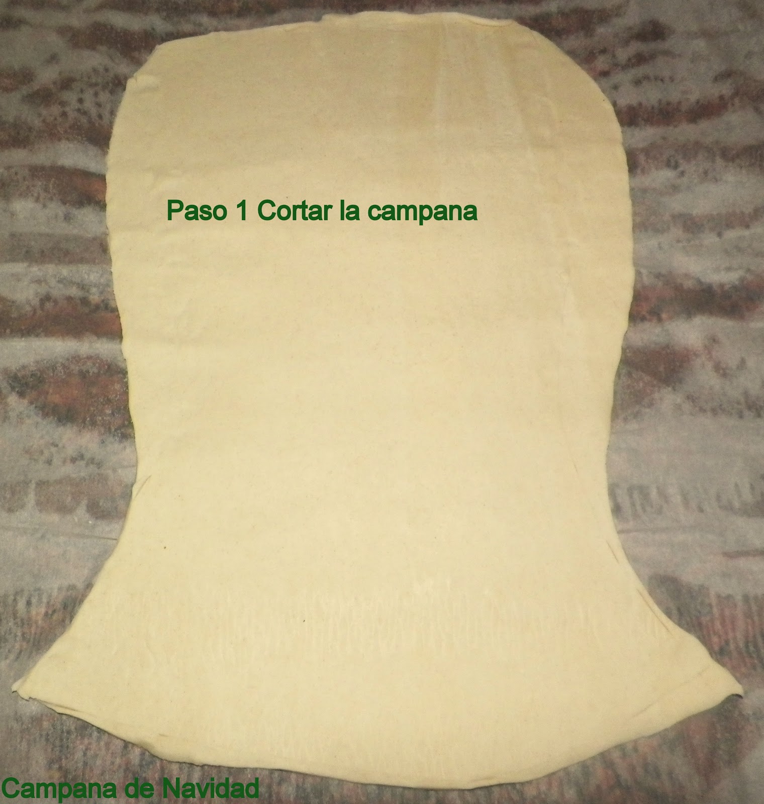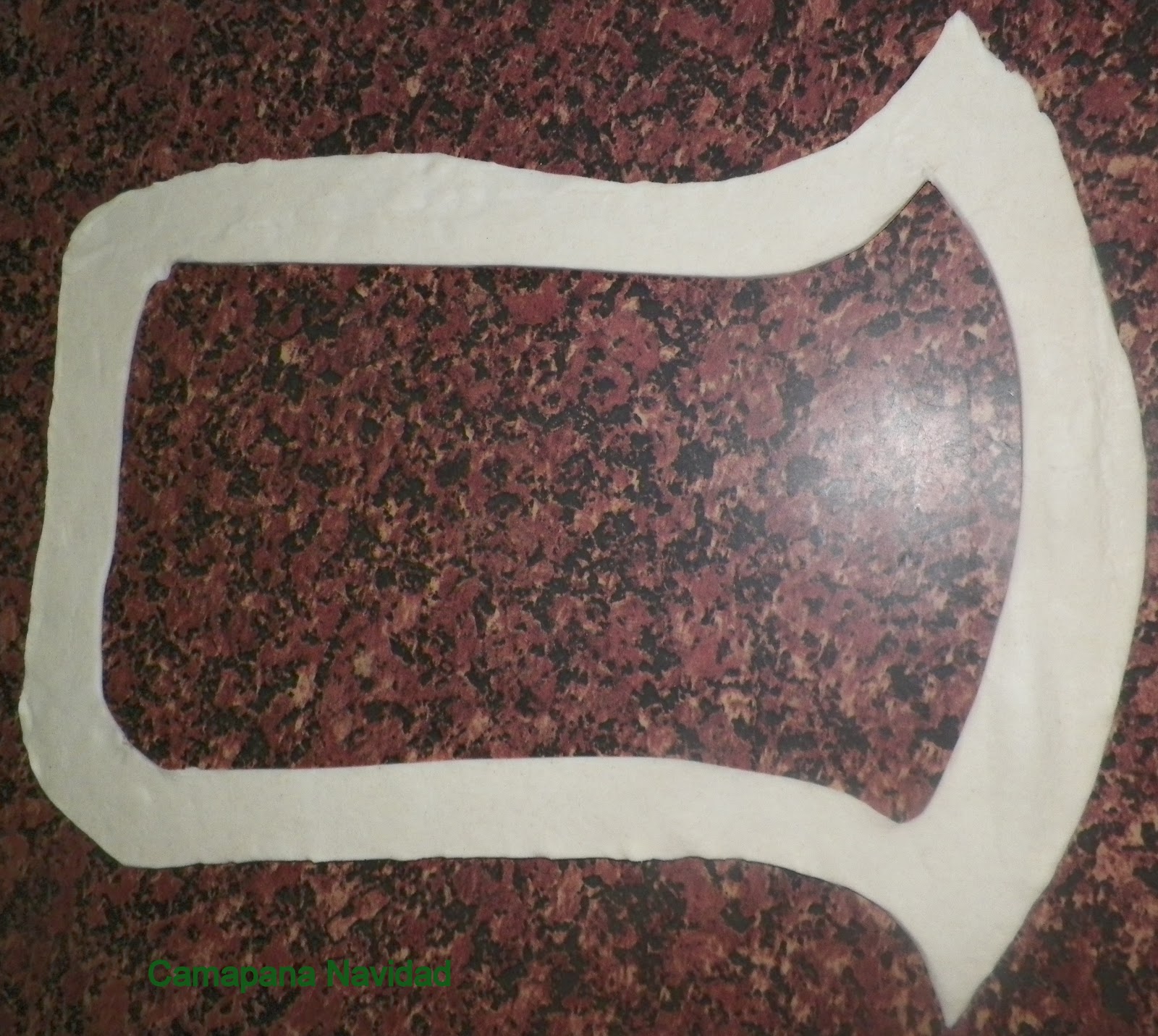 Dibuja el perfil de una campana sobre cartulina, recórtalo y úsalo como molde. Corta tres campanas idénticas de hojaldre de más o menos 30 cms. de largo. Pon en una bandeja de horno una de las campanas y pínchala con un tenedor para que no se abombe cuando lo metas en el horno. Coloca una a una las otras dos campanas, recórtales el centro y deja aproximadamente 2 cms. de borde. Con una brocha échale agua y vas pegando los bordes para ir haciendo una cavidad. Reserva el resto de masa que va sobrando para hacer con unos cortadores de galleta 8 estrellas o alguna otra figura que quieras y un círculo más grande y otro más pequeño para hacer el asa por donde va la cinta de arriba. Con la masa restante, hice unas palmeritas. Hice 8 estrellas para darle más volumen al adorno igual que los círculos de arriba, lo que quiero decir es que hagas el doble en vez de una estrella 2 y las pegas con agua.