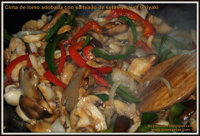 Hola a todo@s… Aquí te traigo una receta de Cinta de lomo adobada con salteado de setas y salsa teriyaki. Aprovechando que ahora hay unas setas estupendas y a muy buen precio, se me ocurrió hacer un salteado con las setas, cebolla, pimiento y salsa teriyaki, la famosa y rica salsa japonesa, hecha con salsa de soja, sake (vino de arroz), vino blanco dulce y un poco de azúcar que le da ese sabor dulce característico y como tenía unos filetes de cinta de lomo adobada en casa, pues que mejor combinación, me puse manos a la obra y ha quedado un plato riquísimo!!