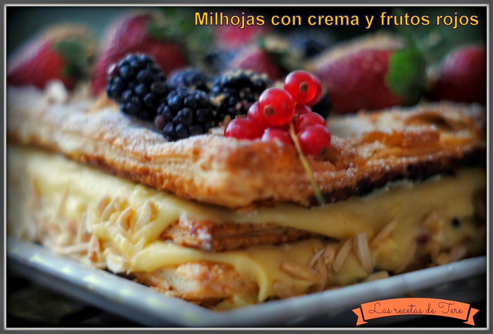 Comencé con una base hojaldre, puse crema pastelera, tapé con otra base, otra vez crema hasta terminar con hojaldre. Corté trozos de fresa y se los incorporé con las capas de crema. Con las almendras tostadas y partidas, las cuales metí en el horno con azúcar glas y quedaron crocantes las fui poniendo por todo el borde de crema. Espolvoree con azúcar glas y almendras molidas en la superficie y luego los frutos rojos, el resultado, espectacular!!!