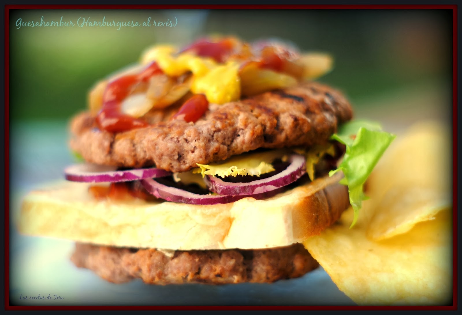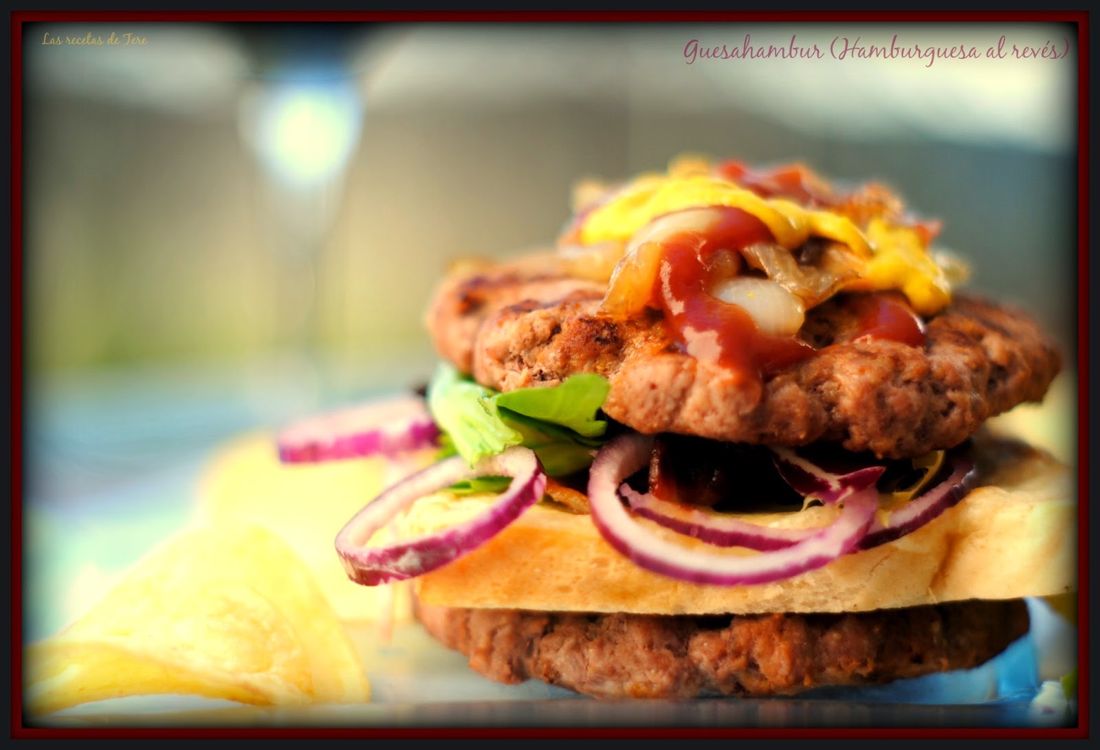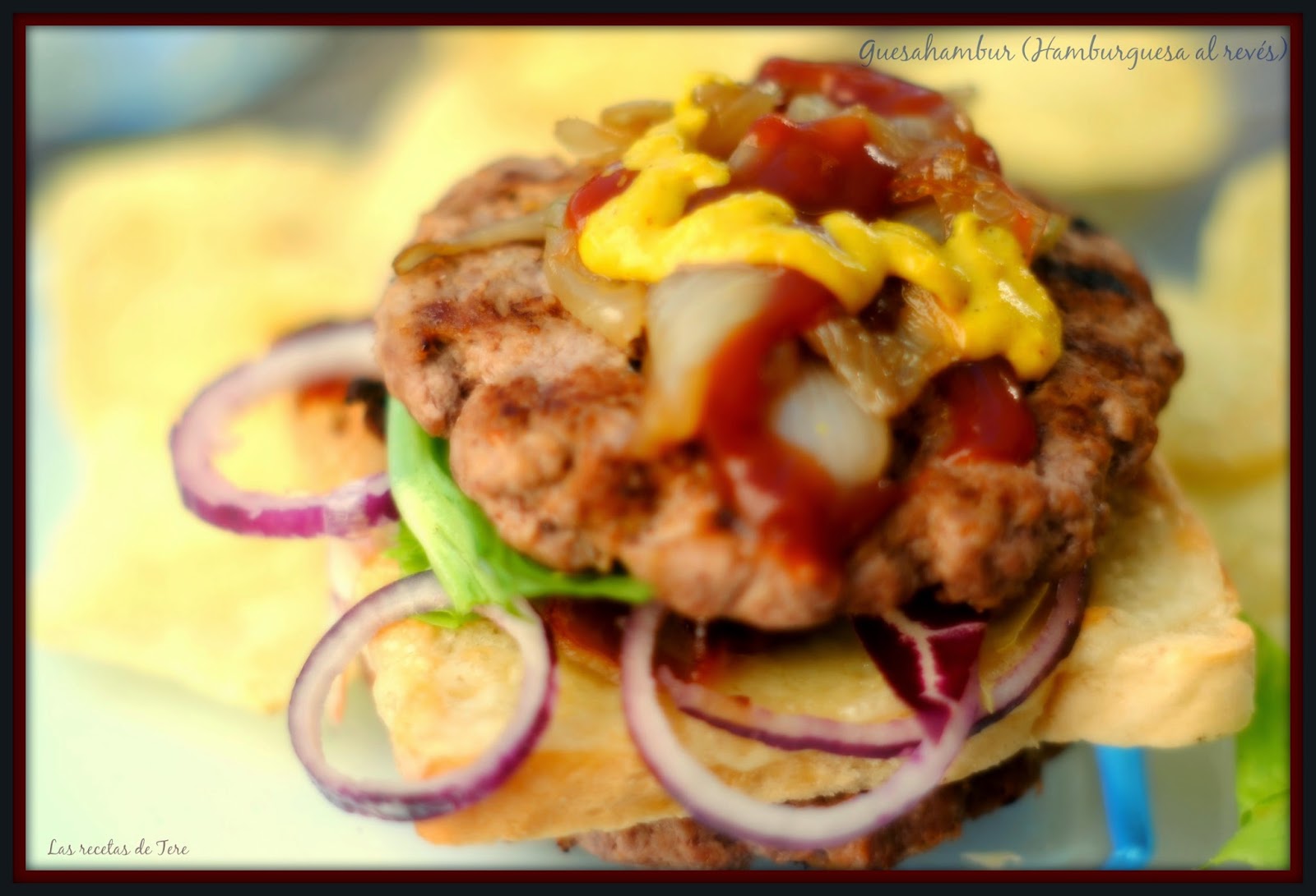 Ahora armas la guesahambur donde las carnes hacen de tapas, el pan con el queso y bacon de carne y la adornas con la cebolla caramelizada, le pones la lechuga, la rúcula y la cebolla morada entra el pan y la carne. Las salsas ketchup y mostaza las puedes poner tanto dentro como por fuera. Acompaña con patatas fritas y un vino tinto suave…Delicioso!!