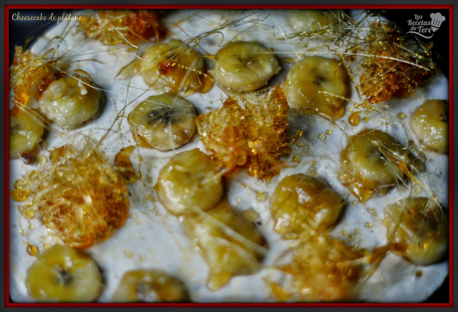 Adorna la cheesecake con estos plátanos pasados por el ron y los hilos de caramelo, el caramelo tenderá a derretirse una vez lo pongas sobre la cheesecake, eso le dará un sabor delicioso.