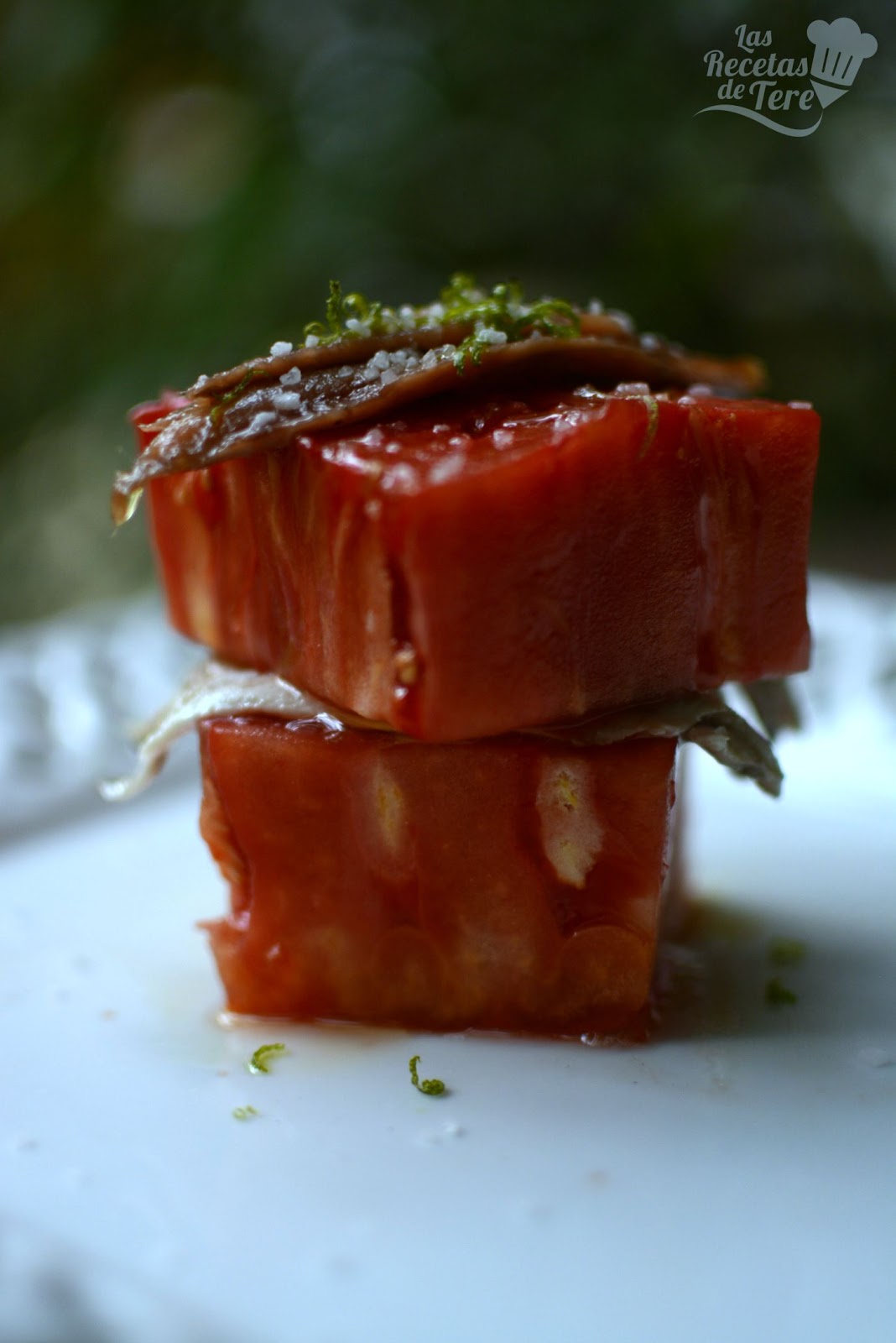 Ahora echa un poco de ralladura de la lima encima de las anchoas, agrega las sal gruesa a tu gusto y rocía generosamente con el aceite de oliva virgen extra, repite la operación con cada uno de los tomates, sirve y acompaña con un vino blanco Glárima de Sommos bien frio, algo digno de probar!!! Uhmmm!!!! Vaya receta tan rica!!