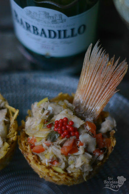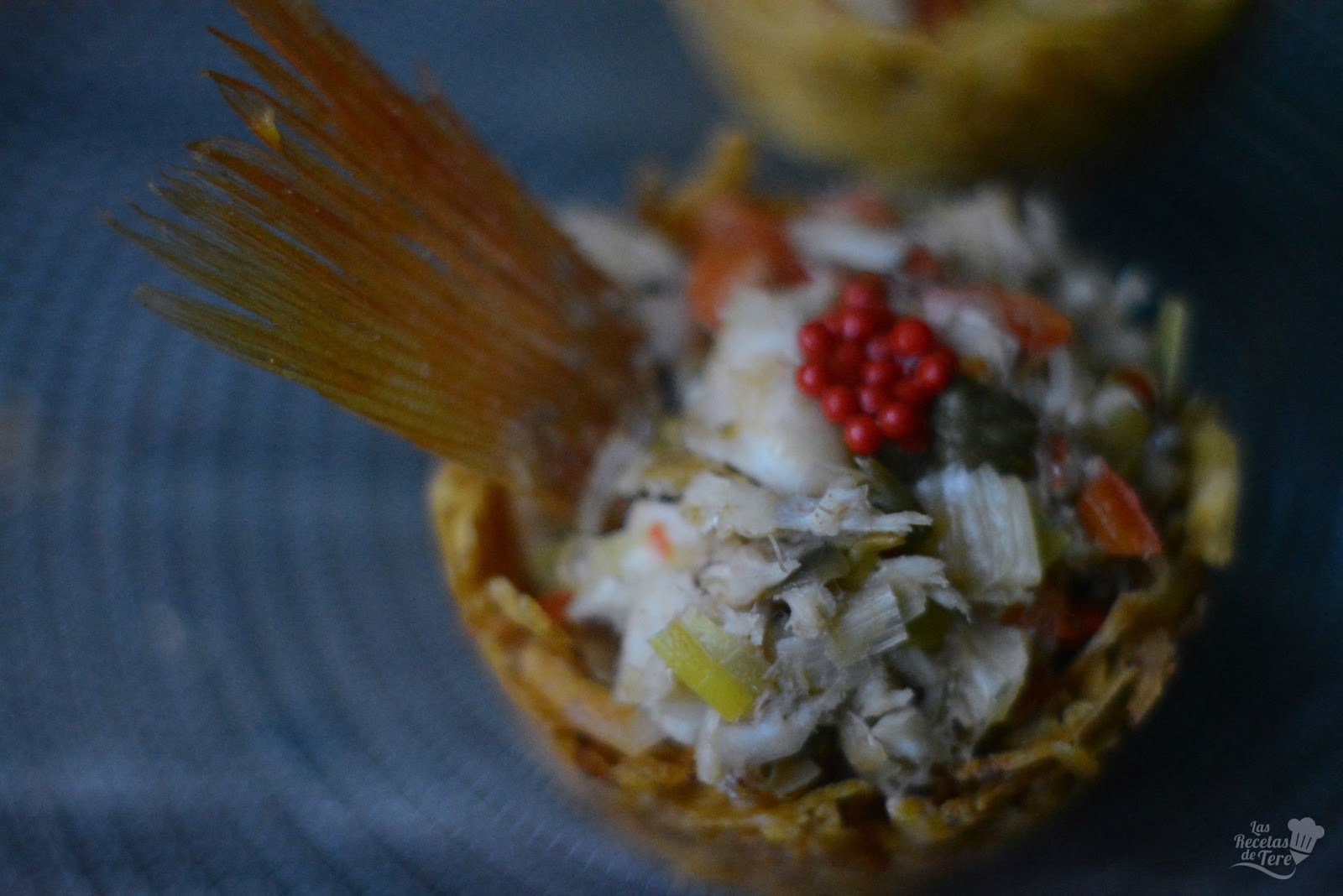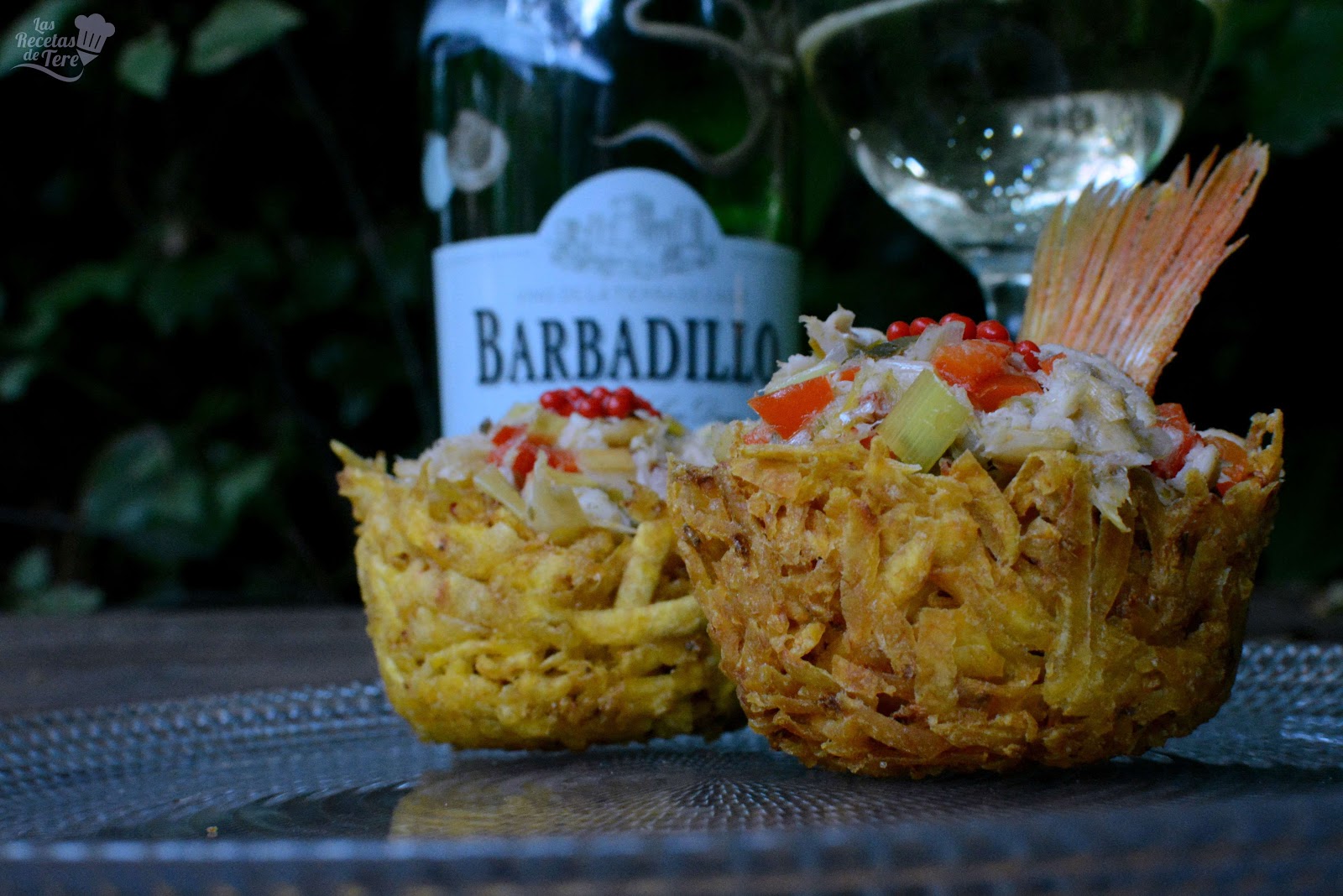 Ahora con los nidos ya listos y calientes, los rellenas con el guiso del cabracho, que previamente debes volver a calentar y adornas con las huevas de arenque, puedes utilizar también como adorno huevas de trucha, salmón, mujol, etc.