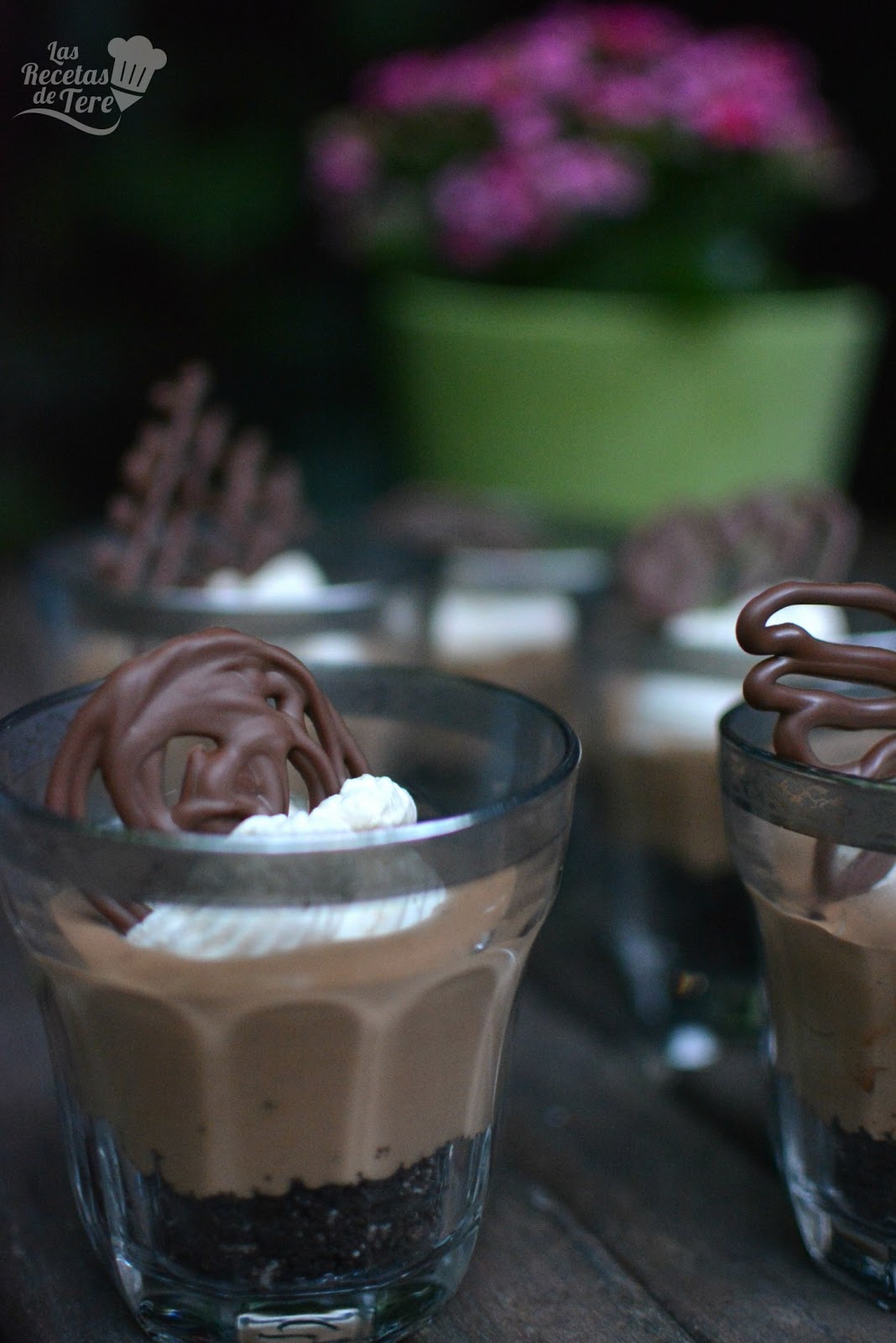 Extiende o llena los vasitos de la mezcla de las galletas oreo trituradas y la mantequilla fundida. Mete en la nevera por 45 minutos.