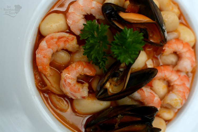 Una vez abiertos, agrega el perejil picado y deja cocinar 3 minutos más a fuego lento. Añade los mejillones, su caldo (colado) a las alubias, así como los langostinos pelados y limpios. Deja cocinar 5 minutos más para que los langostinos se cocinen.