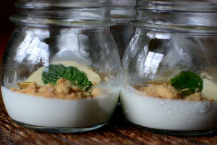 Pon a hidratar la gelatina con agua fría. Infusiona la nata con las hojas de hierbabuena, cuela y mezcla con la gelatina previamente hidratada. Incorpora el resto de ingredientes. Coloca directamente en el vaso y deja enfriar.