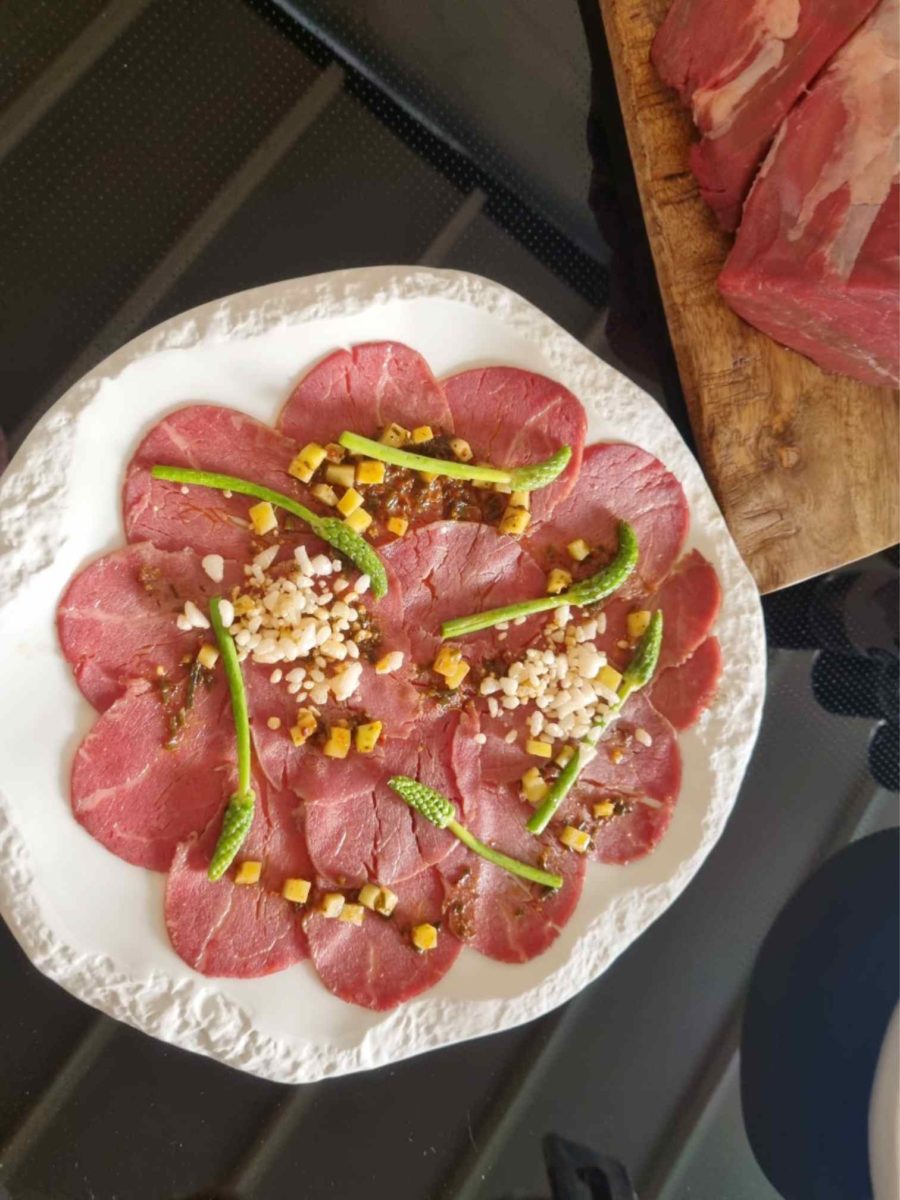 Carpaccio en semi cocción, aderezado con chimichurri de tuétano vegetal