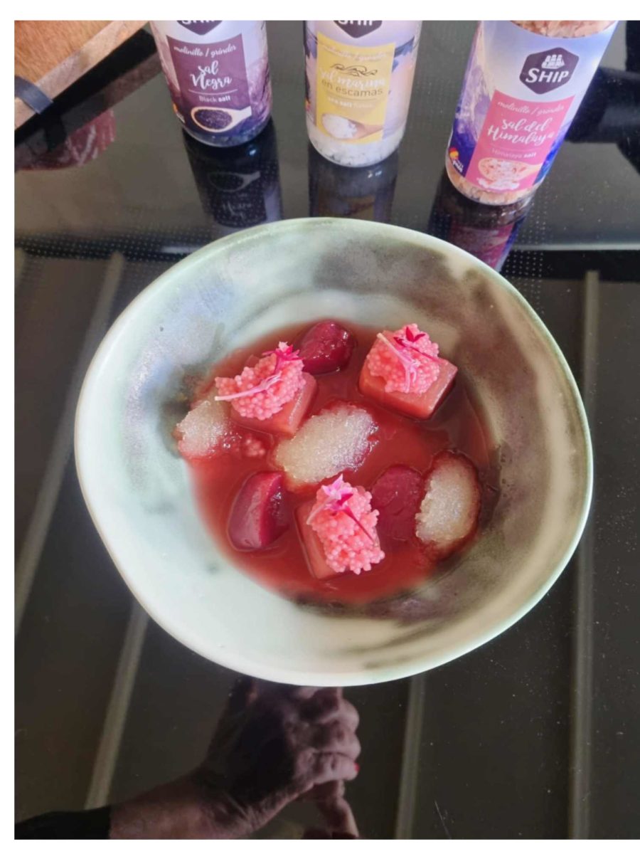 Y para terminar, un postre maravilloso de sandía, flor de hibisco, gel de lima y pimienta de 5 colores de Especias Azaconsa, su historia se remonta a 1870 en el negocio ancestral de azafranes y condimentos.