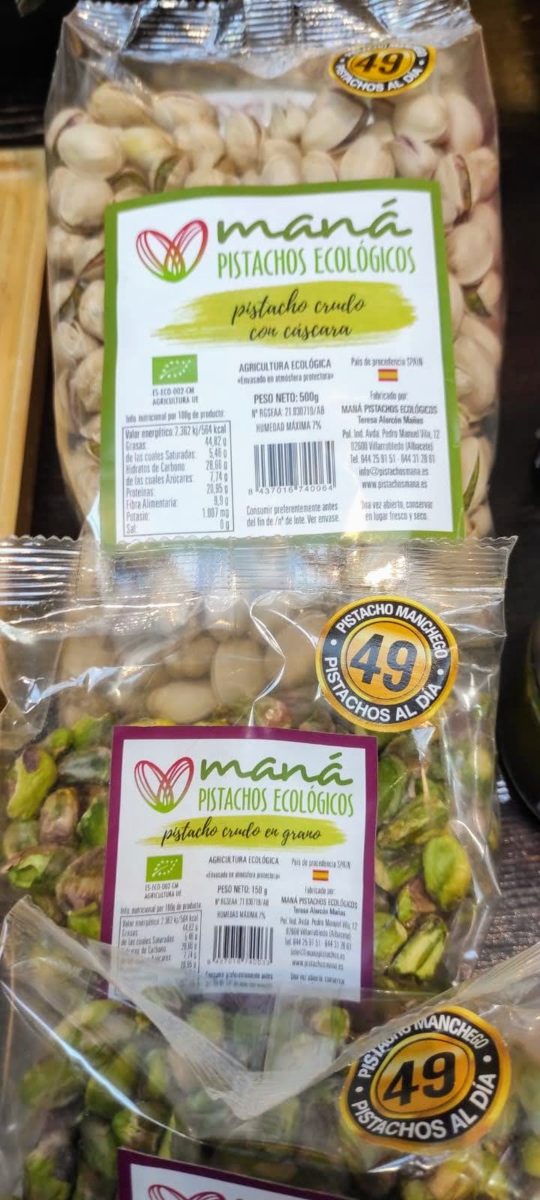 Ahora vamos a Albacete, con los pistachos ecológicos Maná, Villarrobledo, Albacete. Es una empresa familiar basada en la economía agrícola durante generaciones. Cultivan, recogen, procesan y comercializan un pistacho exquisito con el arte del Feng Shui y todo el mimo del que son capaces. Contienen muchísimas propiedades, regulan el colesterol, el estrés, combate la obesidad, es rico en hierro, potasio y es recomendable para controlar la tensión arterial. Son nutritivos y super sanos. www.pistachosmana.es