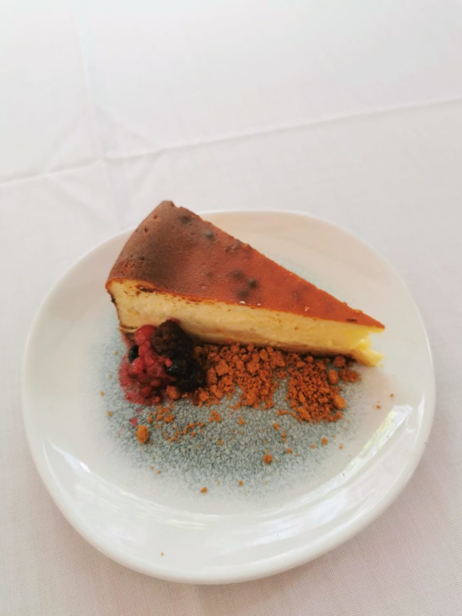 Con esta introducción y este idílico marco, voy a contarles el maravilloso menú: Salmorejo de mango y sandia con flor de brócoli Bejo Ibérica y AOVE Olibaeza, Milhojas de bacalao confitado con salicornia Marshfood y ajada de Pimentón de la Vera DOP, Solomillo de vaca con patatas aasadas y demi-glace, Tarta de queso láctico Granja Cudaña. Todo acompañado con agua del Monte Teleño.
