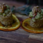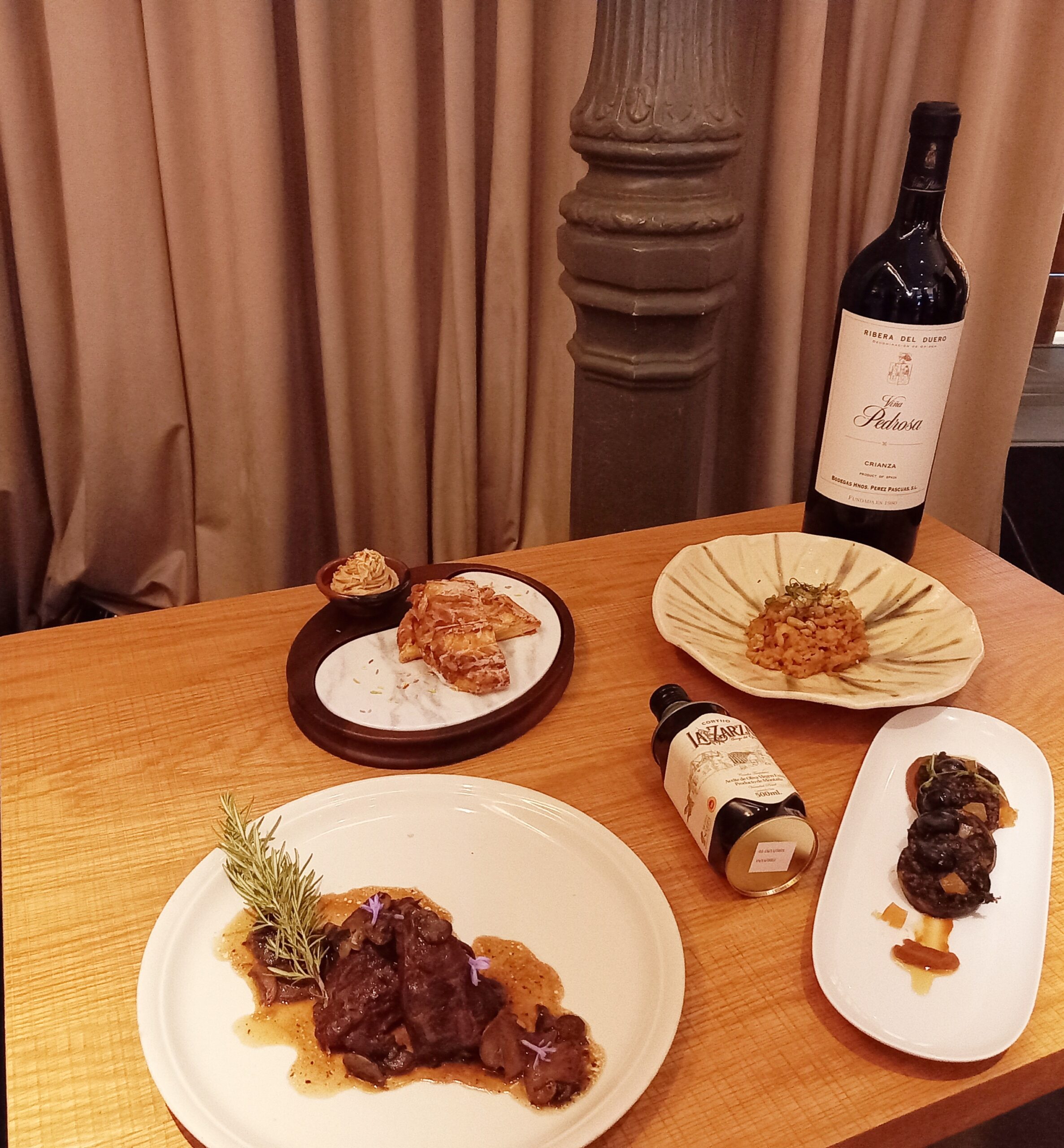 Morcilla de burgos a la parrilla con membrillo en dos texturas y uva africana / Arroz caldoso con habitas y gambitas / Carrilleras en salsa de hongos de temporada al vino tinto y romero/ Trenza con toque de nata agria con mascarpone