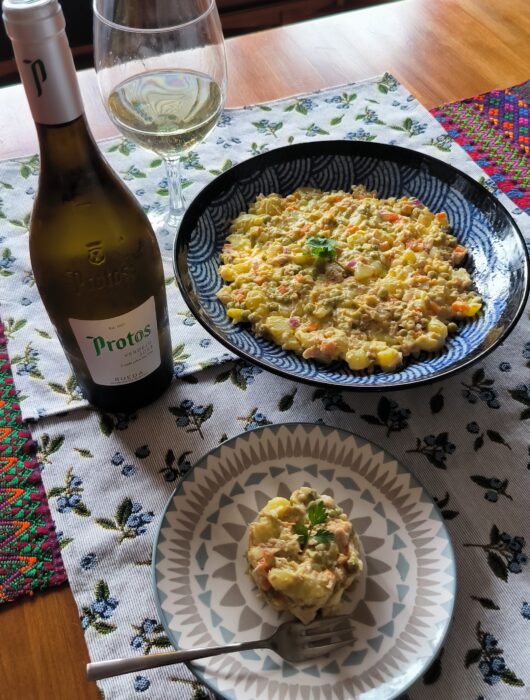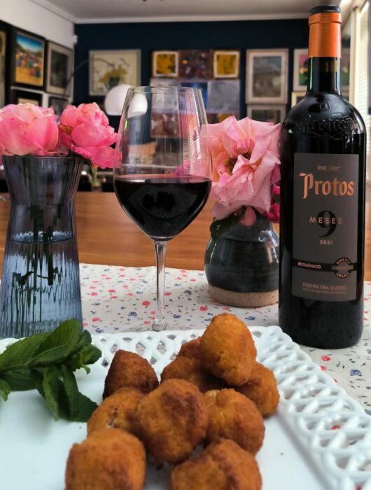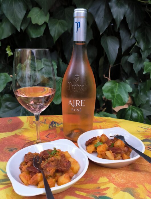 Patatas guisadas con chorizo, un clásico en forma de tapa, acompañadas con vino Aires Rosé de Protos